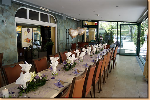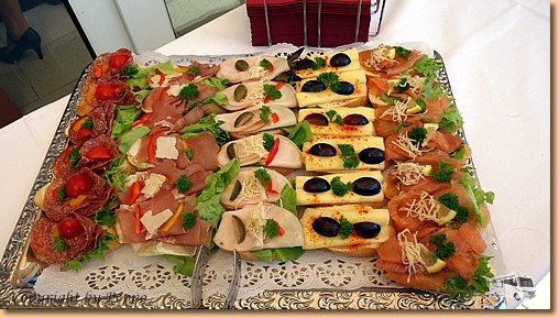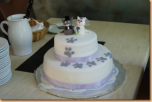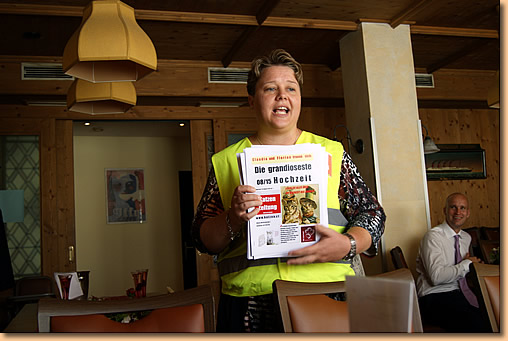 Um 14:00 Uhr macht sich die Familie auf zum gemeinsamen Essen ins Hotel Kramer. Da es die Sonne ziemlich gut meint ist jeder über einen kühlen Schattenplatz dankbar. Ausgezeichnetes Essen, die Tafel liebevoll gedeckt, die Hochzeitstorte "a la Katzen" schmeckt prima - Yvonne's "Katzenzeitung" und unser "mexikanischer Grisu" finden tollen Anklang - es gibt rundherum nur lachende Gesichter.