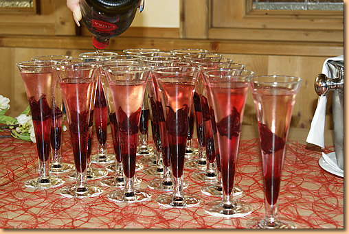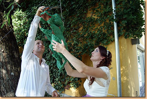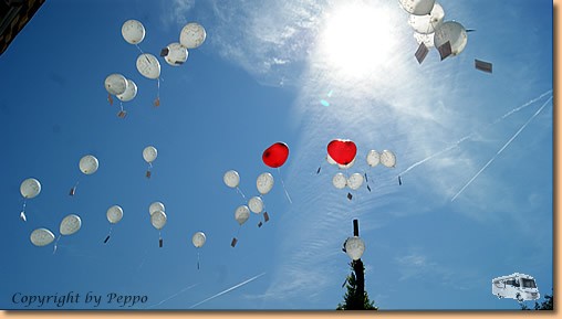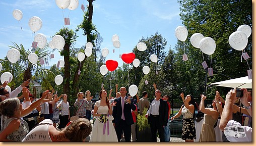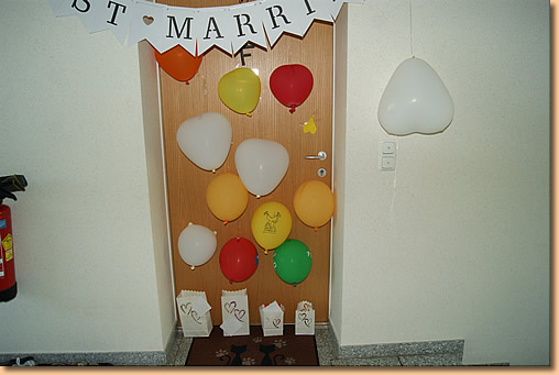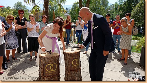 Die Eheleute bitten zur Agape: Sandwich, Gebäck, Prosecco und Wein stehen bereit. Heliumballone werden aufgeblasen, mit Glückwunschkarten versehen und gemeinsam lassen sie wir steigen. Die Beiden müssen sich im "Nägelklopfen" beweisen. Claudia bekommt tatkräftige Unterstützung von Herbert und so wird der letzte Nagel gemeinsam vom frischgebackenen Ehepaar ins Holz gehämmert. Polaroidbilder werden von den Gästen geschossen und gleich mit ein paar netten Worten in ein Hochzeitsbuch geklebt.