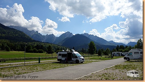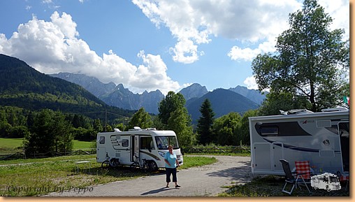 Unser Treitler Peter organisiert das heurige Campertreffen und wir folgen gerne seinem Ruf. Um 13 Uhr treffen wir am Stellplatz von Fusine in Valromana ein und werden von Anna und Peter herzlichst empfangen. Von der Ankündigung auf deren Homepage animiert treffen kurz danach auch Peter, Gisela und Manfred aus Klagenfurt ein. |