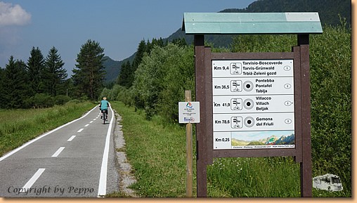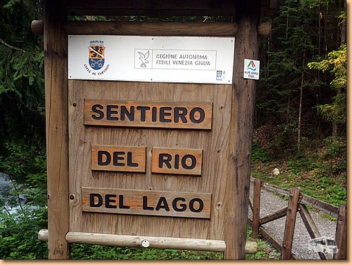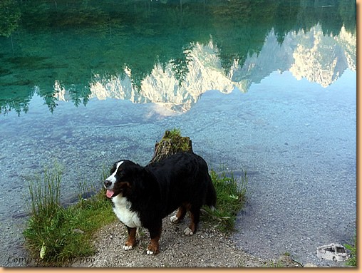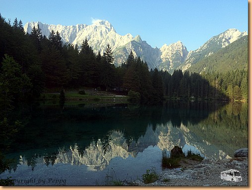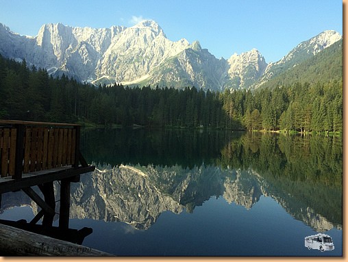 Eine herrlich ruhige Nacht bringt einen wunderschönen Morgen. Unser Morgenspaziergang führt uns ca. 2,8 km weit zum Lago di Fusine inferiore, d.h. zum unteren Weißenfelsersee. Kurze Rast, Fototermin, Pfotenkühlen und dann wieder retour zum Womo. |
