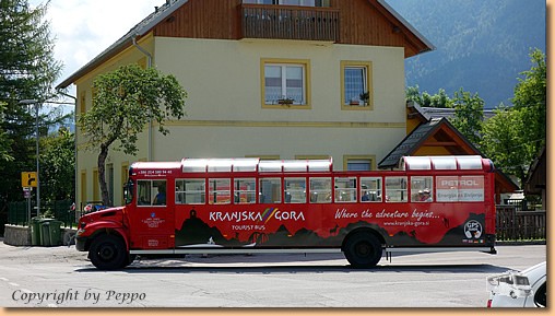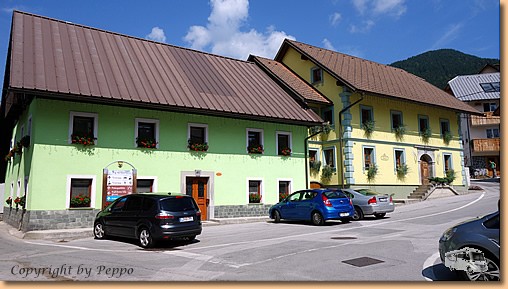 Nach dem Frühstück gibts die nächste sportliche Betätigung: Peter und ich fahren mit dem Rad nach Slowenien, nach Ratece mit dem Auftrag im Gasthaus Surc Plätze zu reservieren. Pflichtgemäß wird der Auftrag ausgeführt, inclusive Einkauf beim Greissler und Bierverkostung, denn der Weg von ca. 3,5 km ist ohne 2x-Rast fast nicht zu schaffen. |