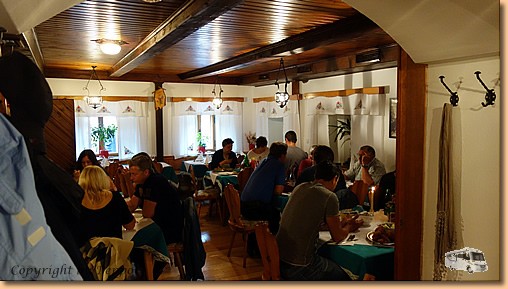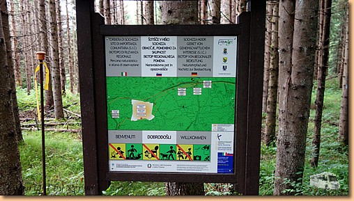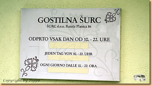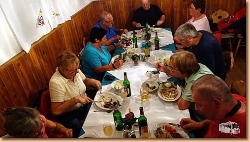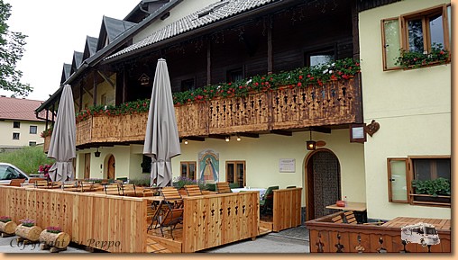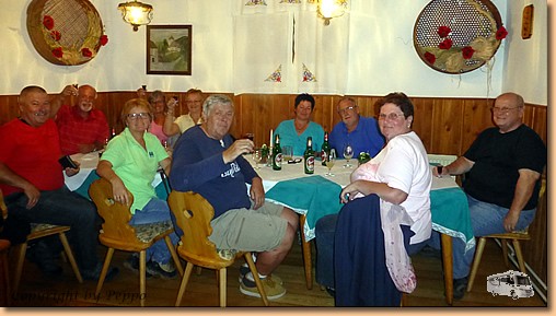 Gegen 2 Uhr morgens fängt es ordentlich zu regnen an, die einzige Regenpause bis Mittag ermöglicht Müsli und Helga einen Morgenspaziergang im Trockenen. Mittagessen im Gasthaus Surc, wir marschieren alle dem Radweg entlang nach Ratece. Traudi und Hans treffen ein und damit erhöht sich die Teilnehmerzahl unseres heurigen Campertreffens bereits auf 10 Personen + 2 Vierbeiner. |