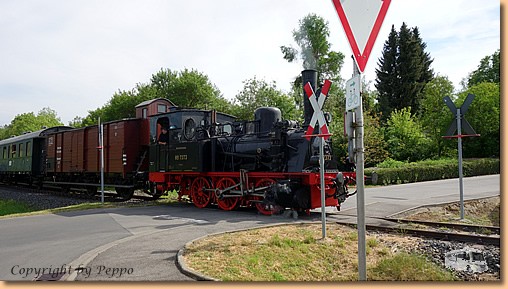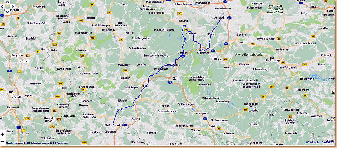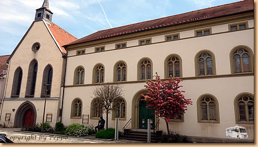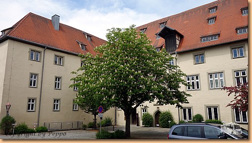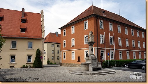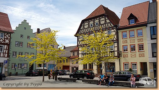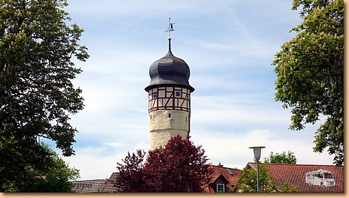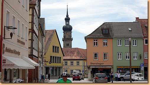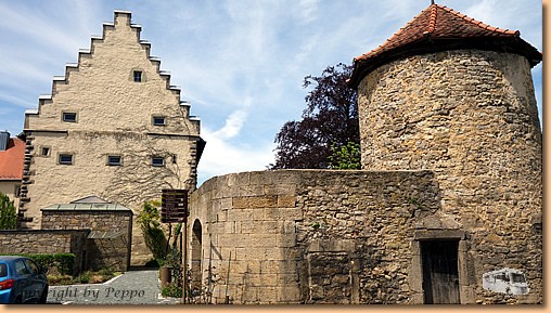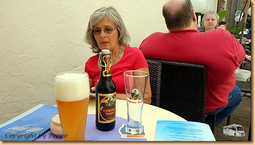 Weiter gehts nach Mellrichstadt. Am Stellplatz sind noch 2 Plätze frei, eine halbe Stunde später sind wir komplett. Die Sonne meint es ziemlich gut, trotzdem machen wir uns auf zur Stadtrunde. Viel ist nicht zu sehen, also sitzen wir bald in einem schattigen Garten und genießen ein kühles Bier, wobei ich mir platzmäßig schon etliche Gedanken um meine Helga mache. |