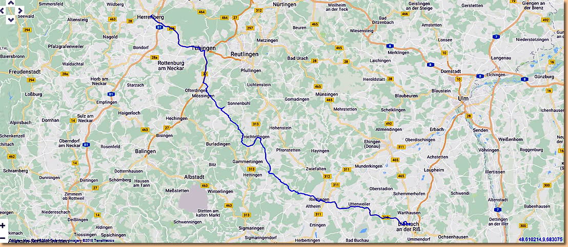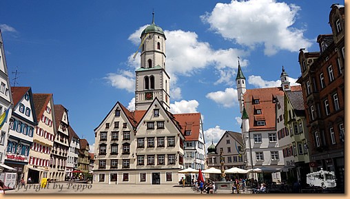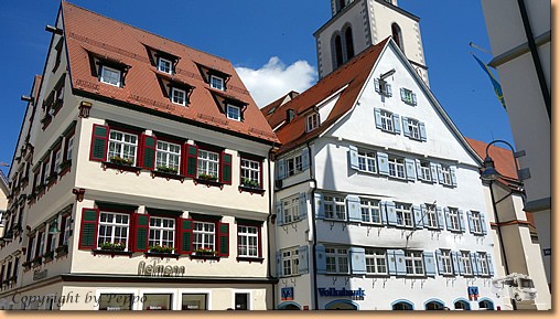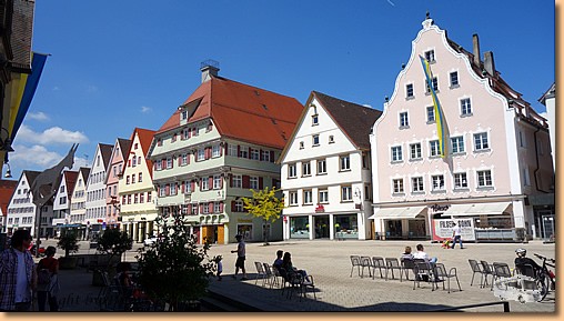 Der heutige Tag ist Balsam für unser etwas ramponiertes Nervenkostüm. Herrlicher Sonnenschein begleitet uns auf einer wunderschönen Strecke durch die schwäbische Alb Richtung Biberach an der Riß. Der Stellplatz ok, wir plazieren uns als Womo Nr.9 und machen uns gleich auf zum Stadtbummel. Uns erwartet eine wunderschöne Altstadt mit sehenswertem Marktplatz, der Simultankirche St. Martin und tollen Fachwerk- und Bürgerhäusern. |