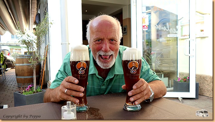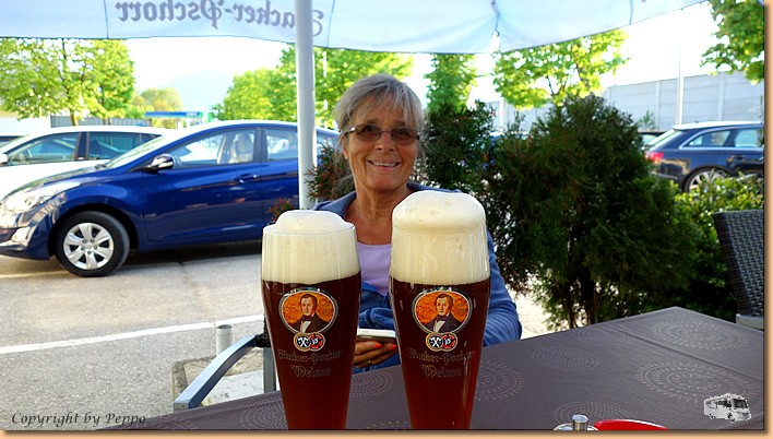 Der Morgenspaziergang am Inn ist fast so schön wie an der Drau. Um 8 Uhr ist Abfahrt und kurze Zeit später treffen wir bei der Fa. Caravan-Company Wolfrum in Raubling ein. Unser Womo kommt sofort in die Werkstatt, Müsli und Helga suchen sich einen Schattenplatz und machen sich es gemütlich. Gegen 16 Uhr haben wir unser Haus wieder, die Dichtigkeit ist überprüft, die kleinen Mängel behoben und der Platz für die Übernachtung ist perfekt. Die Bordküche wird aktiviert und vorbeikommende Womoschauer bekommen gleich Einblick ins Camperleben. Am Abend spazieren wir ins Städtchen und ab heute gibt es niente Vino bianco o rosso sondern helles und dunkles Weißbier. |