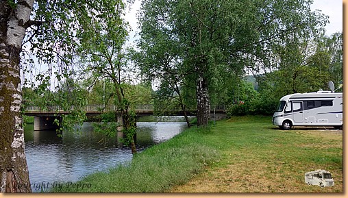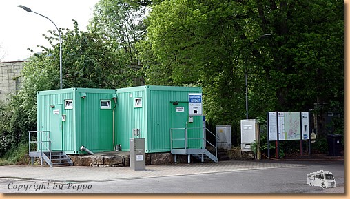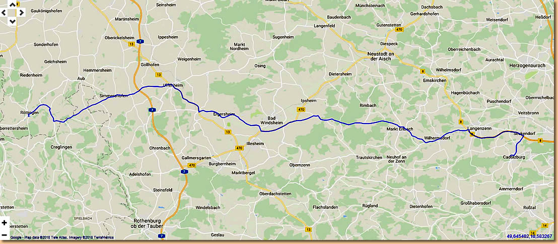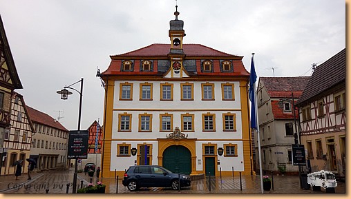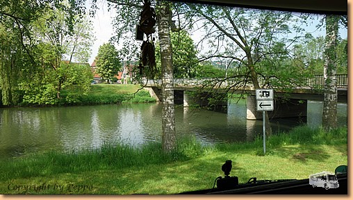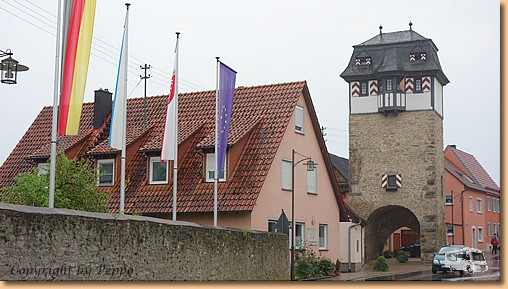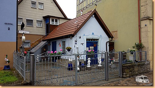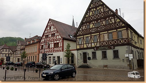 Eine angenehm ruhige Nacht liegt hinter uns, der Morgenspaziergang fällt auch im Trockenen aus und wie jeden Tag gehts um ca. 9 Uhr weiter. Kurz vor Röttingen fängt es dann zu regnen an und wir machen vorerst Regenschicht. Nach dem Motto: Es gibt kein schlechtes Wetter sondern nur unpassende Kleidung heißt es dann Regenjacke an, Schirm aufgespannt und ab in den Ort. Zaghafte Vorbereitungen für das geplante Weinfest fallen vorerst dem Schlechtwetter zum Opfer, hoffentlich wird das Wochenende trockener und wärmer. Wir kaufen nur Kuchen und Brez'n, denn wenn wir nicht im Freien sitzen können ziehen wir unser Womo als Gaststätte vor. |