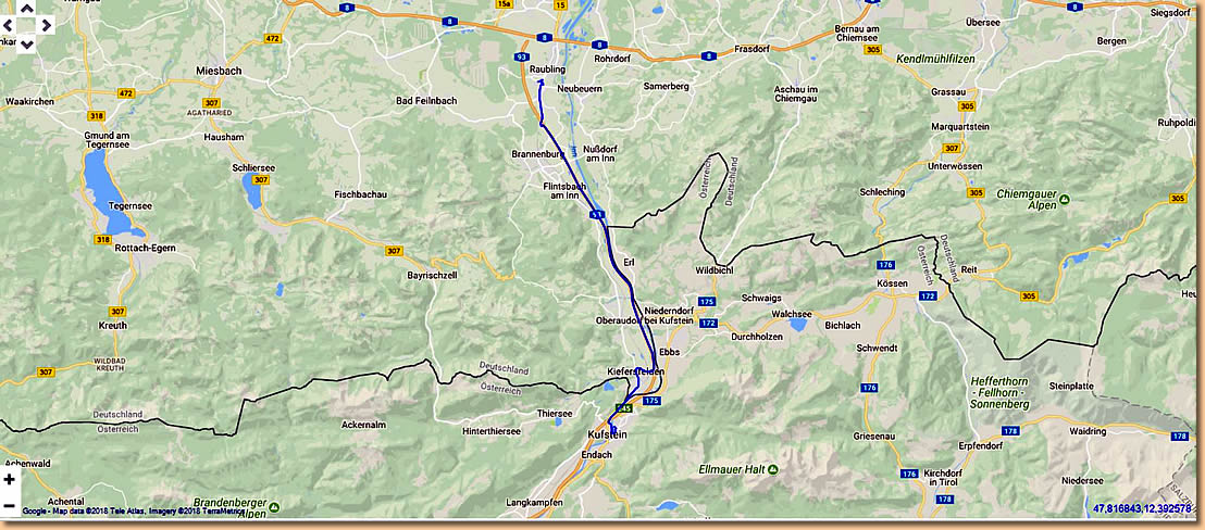 Zurück zum Händler steht unser Womo schon in Fahrtrichtung. Alle Arbeiten erledigt, allerdings ist für den Einbau des Radios mit spezieller Navigation aus verschiedesten Gründen ein neuer Termin notwendig. Wir müssen also am 25.6. noch mal für ca. 4 Tage ins Werk. Wir fahren das kurze Stück bis Kufstein, bekommen den letzten freien Platz und aufgrund dunkler Regenwolken lassen wir diesmal einen Stadtrundgang aus. |