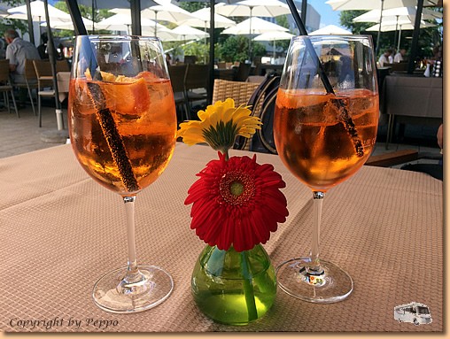 | Im Warmbaderhof erhalten wir den 4. Etappenstempel und im nahen Cafe den wohlverdienten Aperol. |