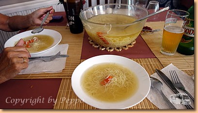 Mittags bleibt die Küche kalt, wir lassen uns mit einer Suppenterrine sowie gebackenen Palatschinken mit pikanter Fleischfüllung verwöhnen, wobei man sich nach der Bestellung immer überraschen lassen muss! |