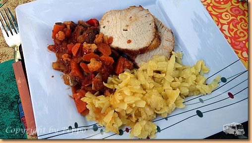 Unser heutiges Highlight ist wieder einmal eine schweizerisch-österreichische Essensproduktion. Toni zaubert wieder auf seinem Griller einen wunderbar schmeckenden Braten, Yvonne ist für die Rösti zuständig und das Gemüseragout stammt aus Kärntner Küche. Nassfutter wird redlich geteilt.