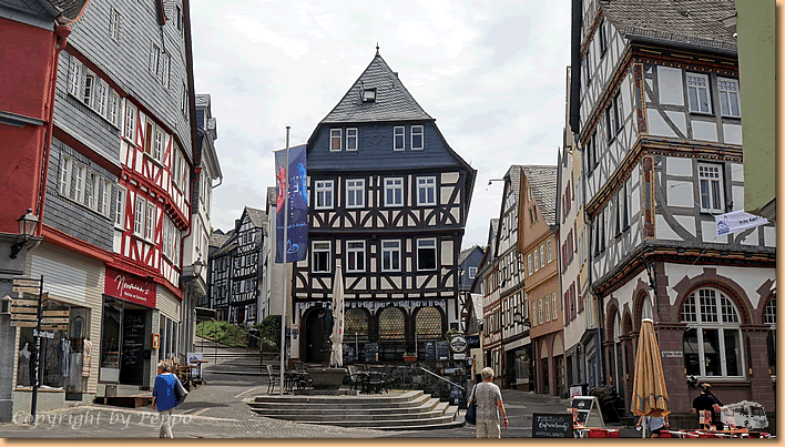 Um 9 Uhr ist Abfahrt, wir füllen bei Lidl unsere Vorräte auf und dann geht es ohne Verkehrsprobleme nach Wetzlar. Der Stellplatz an der Dill ist halbvoll, allerdings kommen bis zum Abend noch einige Fahrzeuge hinzu. Obwohl es ziemlich warm ist spazieren wir ca. 1 km bis zur Altstadt und dann noch einige Zeit durch sie hindurch. |