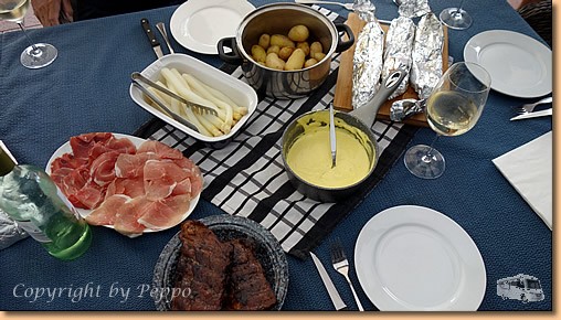 Kleine Mobilhomes in Form eines Tunnels, ganz mit Schindeln verkleidet und auch Baumzelte befinden sich hier. Und natürlich jede Menge Wochenendhäuser die man kaufen oder mieten kann und in denen viele das ganze Jahr auch wohnen. Wir werden von Bernd wieder zum Essen eingeladen und es schmeckt einfach super. Frischer Spargel (gegrillt und gekocht), heurige Kartoffeln, Sauce Hollandaise und rohen Schinken zaubert er auf den Tisch. |
