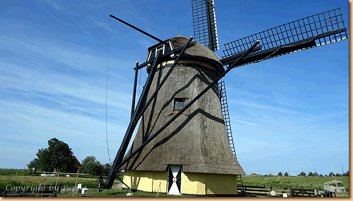 Heute trennen sich Bernds und unsere Wege. Bernd hilft dem Bruder bei seinem Boot und da würden wir Landratten wohl nur im Weg herumstehen. Also schwingen wir uns alleine auf die Räder und fahren nach Workum. Zwei Windmühlen werden besichtigt und natürlich begeistern uns wie immer die unzähligen Grachten. In Workum besichtigen wir die Stadt, sitzen im Cafe und sind in Kürze von zahlreichen Radlern umgeben. Egal ob Touristen oder Einheimische, hier ist fast alles auf zwei Rädern unterwegs. |