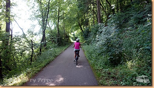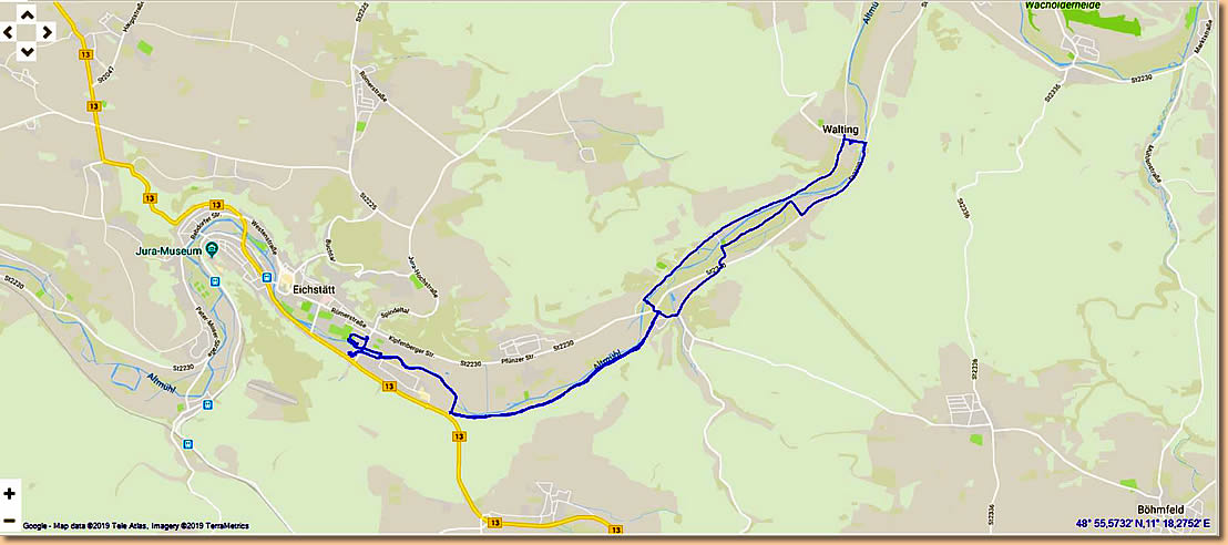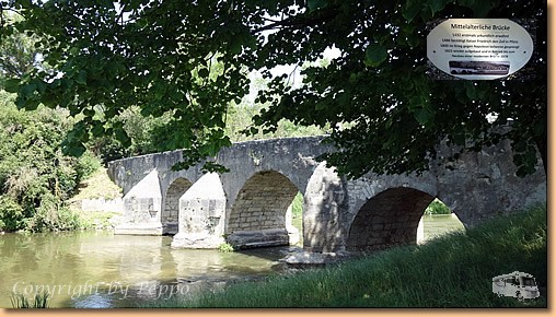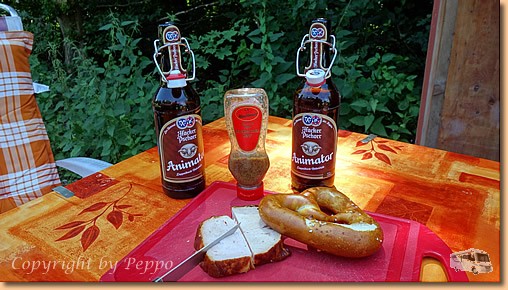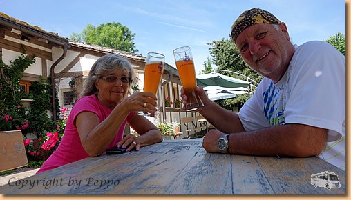 Unser Wärmespender macht Überstunden und wir beschließen aufgund der prognostizierten 35°C einen Tag Pause einzulegen. Die noch etwas angenehmere Temperatur am Vormittag nützen wir für eine Radltour entlang der Altmühl. Verdiente Pause in Walting, ein kühles Weizen und ein schattiger Biergarten und wir sind für die Heimfahrt gerüstet. In Eichstätt fahren wir bei Edeka vorbei und kaufen eine bayrische Brotzeit mit einem dunklen Doppelbock ein, die wir uns dann im Schatten vorm Womo schmecken lassen. |