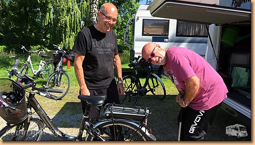 Sonnenschein den ganzen Tag. Die Räder werden aktiviert und wenn Klaus nicht an unserem Womo werkelt nimmt er sich halt unsere Drahtesel vor. Während Bärbl und Klaus eine längere Tour machen, reichen uns 33 km. Wir fahren auf wunderbaren Radwegen nach Tauberrettersheim, weiter nach Weikersheim Richtung Bad Mergentheim und retour. |