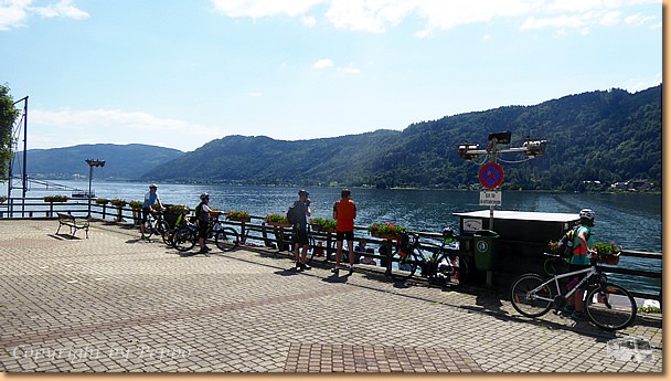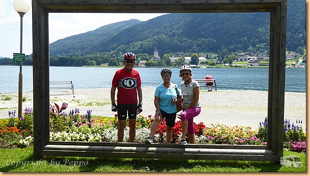 Helgas übliche Morgenrunde führt sie heute fast bis Ossiach und wieder retour. Nach dem Frühstück fahren wir mit Bärbl und Klaus zum Einkaufen. Kaum retour gehts mit dem Rad rund um den See. In Ossiach legen wir bei Kaffee und Kuchen eine Pause ein bevor wir nach insgesamt 30 Kilometern wieder am CP eintreffen. |