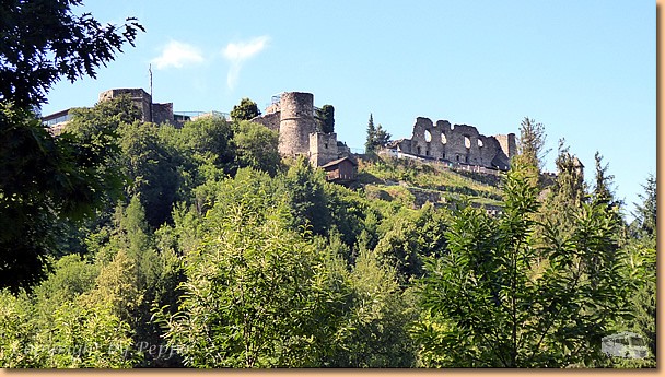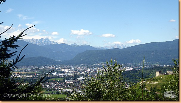 Weiter gehts entlang der Burgherrenrunde rund um die Ruine und bis wir wieder am Ausgangspunkt ankommen haben wir nach 2,5 Stunden Gehzeit 7,5 km hinter uns. Auch ein schöner Blick auf das Villacher Becken tut sich vor uns auf. |