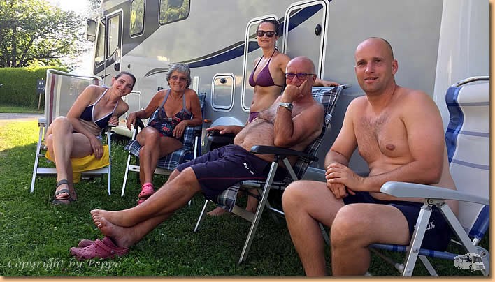 Der Wärmespender meint es extrem gut, wir knabbern an der 30°C Marke. Außer Helgas Morgenrunde stellen wir heute sämtliche Aktivitäten ein und außer baden und lesen gibt es nichts zu vermelden. Radeln tun heute nur unsere Kinder, auch sie genießen das kühle Nass und den Schatten hinterm Womo. |