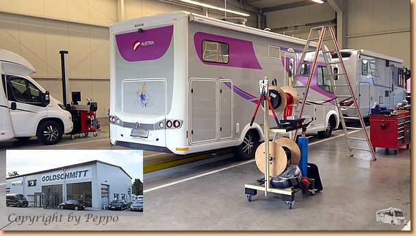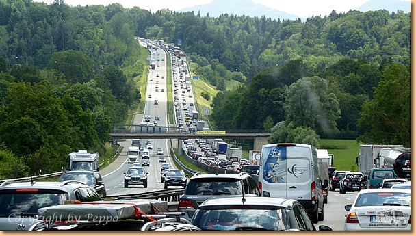 Um 10 Uhr sind wir wieder startklar und nehmen die ca. 200 km nach Raubling in Angriff. Alles läuft bestens bis wir am Irschenberg in einen 12 km langen Stau geraten. Der kostet uns eine gute Stunde Zeitverlust, trotzdem treffen wir pünktlich um 14 Uhr zu unserem nächsten Womotermin bei der Fa. Wolfrum ein. 4 Klappenscharniere werden erneuert und dann fahren wir ohne jegliche Kontrolle bis Kufstein durch. |