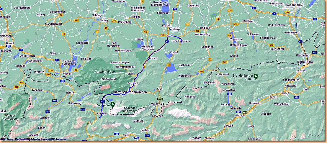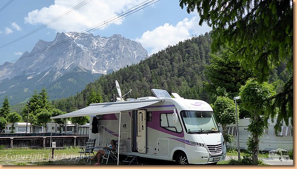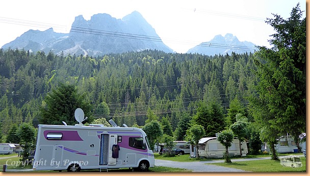 Wir geniessen den etwas bewölkten Tag auf ca. 1000m Seehöhe unter dem Zugspitzmassiv, machen einen Ruhetag daraus und sitzen am Abend solange es geht mit einem gekühlten Weißbier vorm Womo. |