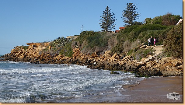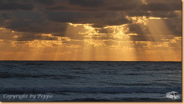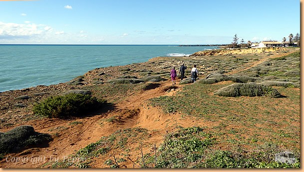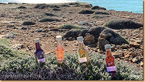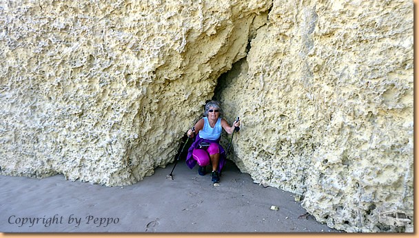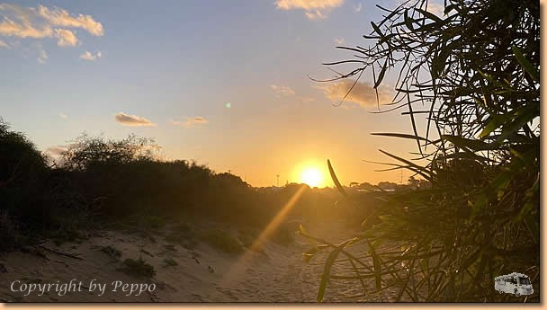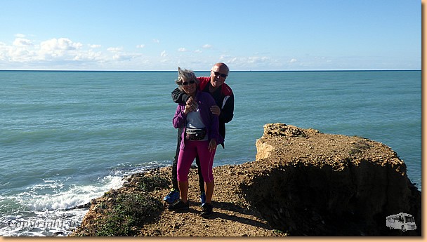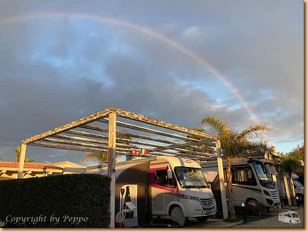 Helga geht heute gleich zweimal baden, als erstes beim Morgenspaziergang und dann beim Neujahrsschwimmen im 15°C "warmen" Mare. Mit der Sonne und einem schönen Regenbogen über unserem Wohnmobil beginnt dann ein wunderschöner Neujahrstag. Mit Bärbl und Klaus spazieren wir gegen Mittag den Klippen entlang Richtung Punta Secca und finden neben tollen Ausblicken gottseidank auch wieder eine kleine aber feine Schnapsbar. |