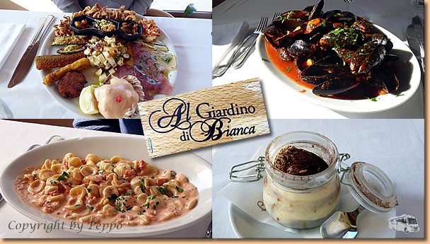 Mit Bärbl und Klaus sind wir zu Mittag im Al Giardino di Bianca verabredet. Wir freuen uns über den lang ersehnten Restaurantbesuch, haben das Lokal fast für uns alleine und geniesen die ausgezeichnete Küche. |