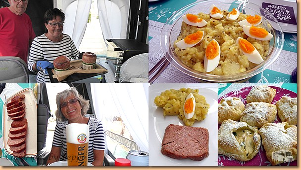 Die Küche bleibt auch heute kalt (außer dem Backofen) denn wir sind bei Bärbl und Klaus eingeladen! Leberkäse, Kartoffelsalat und Weißbier, Herz was willst du mehr. Vielen Dank, eure Vorräte leeren sich , unsere Bäuche dagegen werden immer runder, aber die Welt ist in Ordnung. |