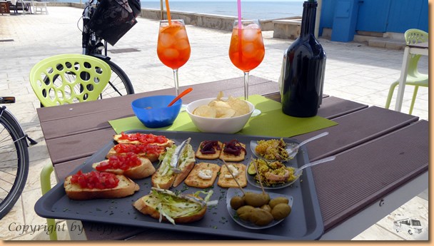 In den nächsten Tagen soll es etwas windiger werden, also heute aufs Radl und zum MD nach Marina di Ragusa. Am Heimweg Zwischenstopp in Punta Secca. Im Ristorante Sand nehmen wir den ersten und den letzten Apero. |