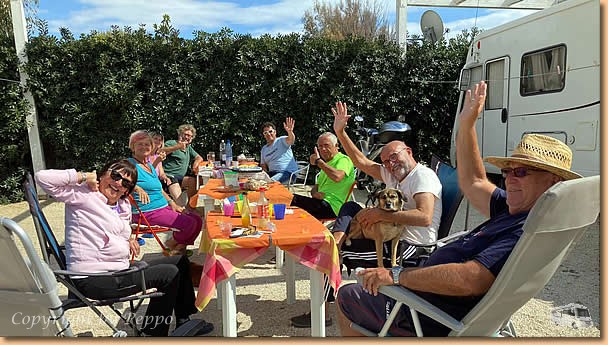 Am Nachmittag überraschen uns italienische Camperfreunde mit einer Einladung zu Gelati, Prosecco und Cafe. Alles korrekt, jeder hat seinen eigenen Tisch mit genügend Abstand. |