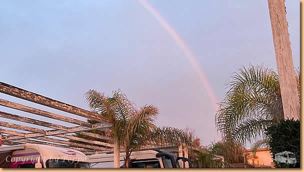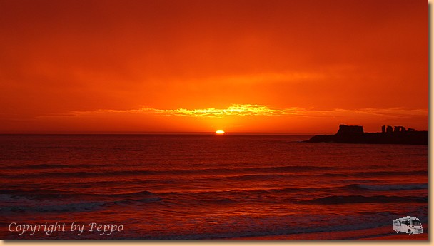Als Tagesabschluss gibt es einen Regenbogen im Landesinneren und einen wunderschönen Sonnenuntergang am Meer mit der Hoffnung auf Wetterbesserung.