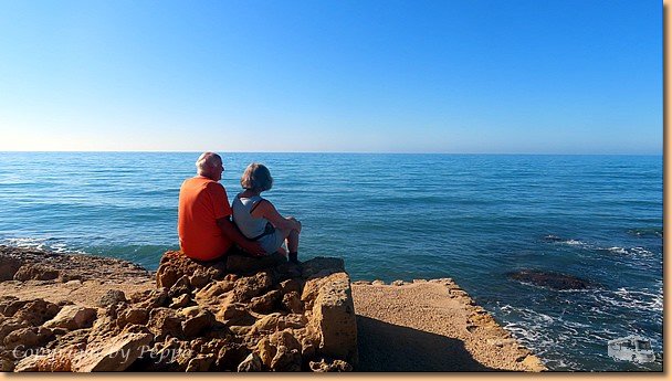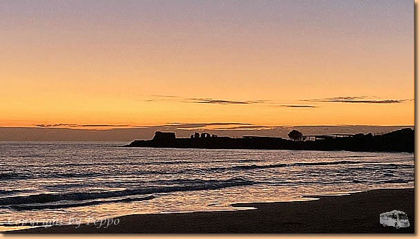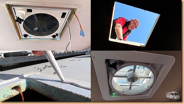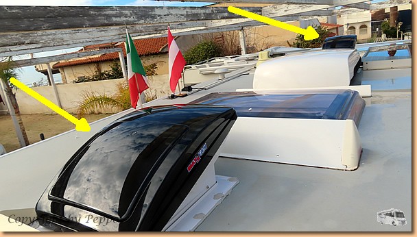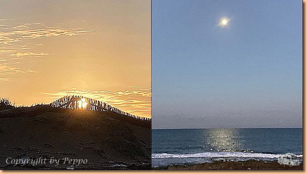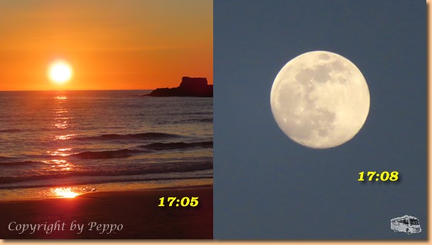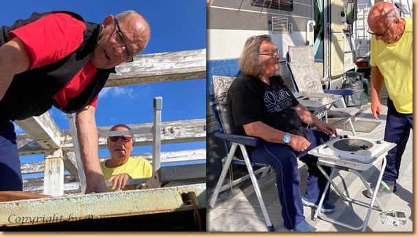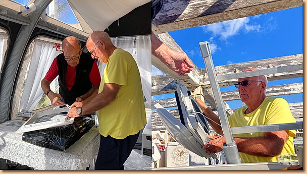 Beim Morgenspaziergang gibt es innerhalb einer Stunde Monduntergang und Sonnenaufgang. Helgas Runde ist die einzige sportliche Aktivität für heute, ansonsten ist totaler Arbeitseinsatz angesagt. Klaus und ich stehen am Dach bzw. auf der Leiter und sind mit dem Einbau der ersten von zwei neuen Ventilatorhauben beschäftigt. Alles funktioniert problemlos, morgen ist vielleicht die nächste dran. Oli ist mit der Reinigung der abgebauten Dachhaube beschäftigt und will sie daheim in sein Womo einbauen. |