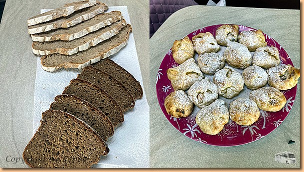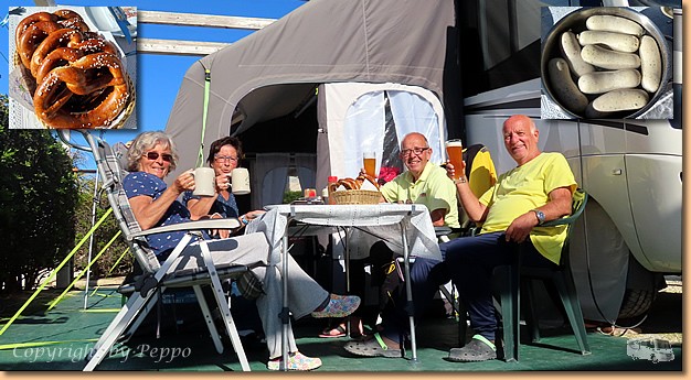 Bärbel ist mit Brotbacken beschäftigt und in unserem Backofen entstehen Topfengolatschen. Um 14:30 Uhr ist Schluss, wir gehen zum gemütlichen Teil über und genießen in der Sonne einen Aperol. Der Hunger meldet sich, also kommen Lachsnudeln und Salat auf den Tisch bzw. in den Magen und dann noch ein bissl relaxen bevor es Zeit für die Homepage wird. |