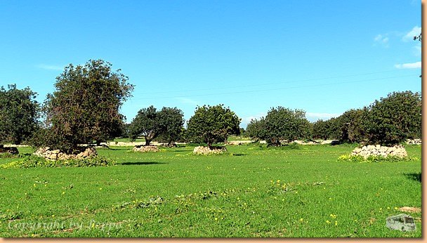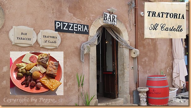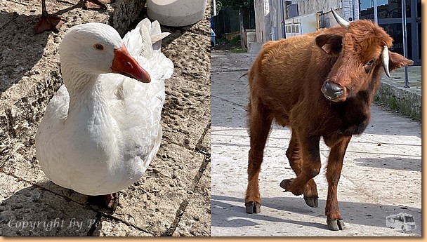 Radelwetter ist wieder und wir nützen das natürlich gleich aus. Zu Mittag geht es auf nach Donnafugata wo wir von 3 Gänsen mit ohrenbetäubendem Geschnatter begrüßt werden. Die Vorspeisenteller samt vino bianco schmecken ausgezeichnet und die Sonne sorgt für ein angenehmes Ambiente. Lautes Getrampel und Gemuhe kündigen den flotten Marsch des Jungviehs von der Weide in den Stall an. Zielgerecht finden sie den Weg und unsere Sorge, sie würden uns einen Besuch abstatten, ist völlig unbegründet. |