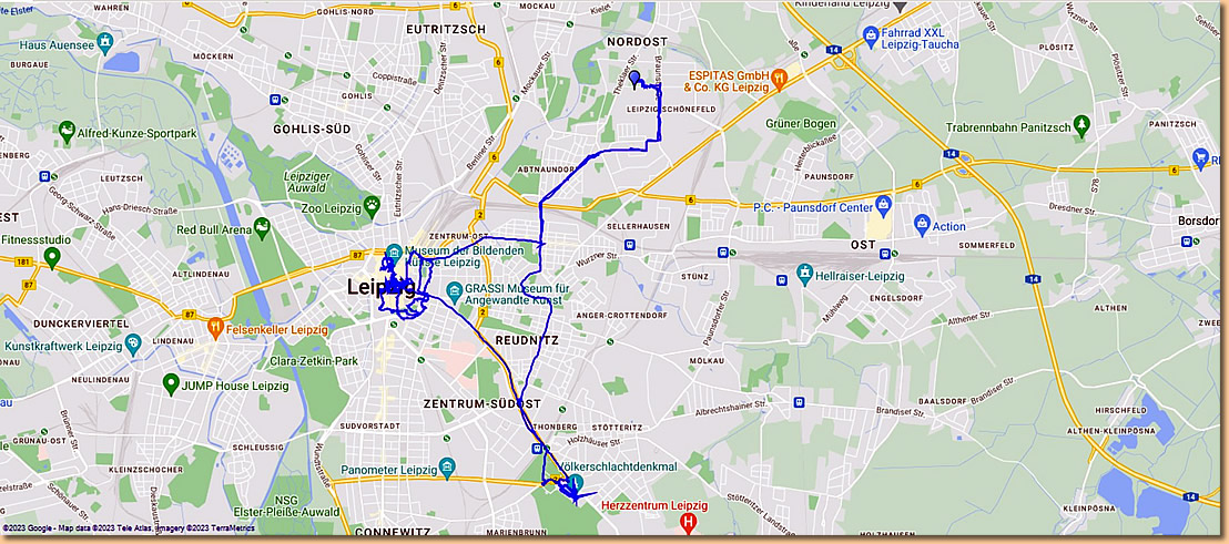 Wir verlassen die Stadt und machen uns auf den Weg zum Völkerschlachtdenkmal. Mit 91 Metern Höhe ist es das höchste Denkmal Europas, 500 Stufen sind zu bewältigen, allerdings kann man von der Krypta aus zum Aussichtsrundgang in 57 m Höhe einen Lift benützen. Mehr als beeindruckt machen wir uns am späten Nachmittag wieder auf den Heimweg, sind froh nach ca. 13 km Fussmarsch unser Womo samt gemütlichen Sesseln im Grünen anzutreffen, allerdings nicht lange, so wie gestern zwingt uns heute ein bisschen Regen ins Innere zu wechseln. |