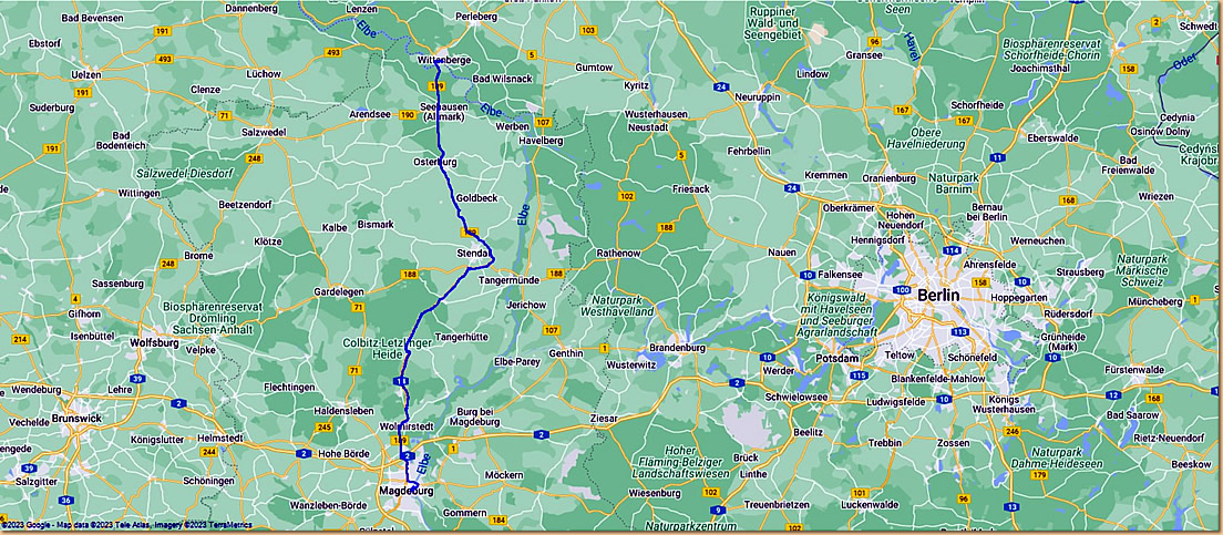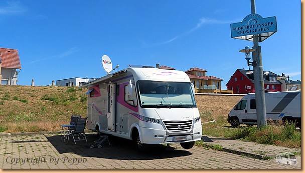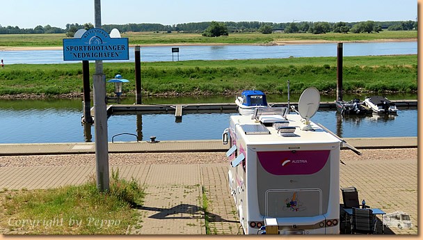 Nach dem Frühstück machen wir uns wieder auf und fahren auf fast leeren Strassen weiter nach Wittenberge. Am "Sportbootanger Nedwigshafen" finden wir Platz, stehen auch hier direkt am Wasser und finden unser heutiges Domizil gar nicht so schlecht. |