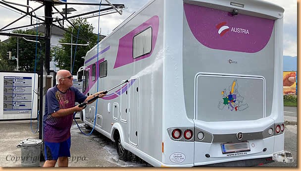 Ab nach Hause, um 9 Uhr starten wir, sind bald darauf in Feistritz bei Helgrumobil. Kurze Besprechung mit dem Chef und dann geht's weiter nach Villach in die Waschanlage zur Wohlfühldusche. |