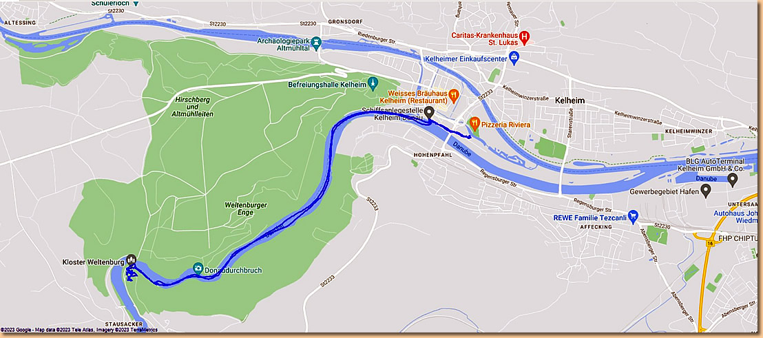 Eine herrlich ruhige Nacht liegt hinter uns, einzig ein paar aufmüpfige Frösche legen ein Konzert hin, wir verzeihen ihnen gnädig. Keine 3 Minuten Fussmarsch und wir sind bei der Schiffsanlegestelle an der Donau. Wir lassen also unsere Räder in der Garage und lassen uns mit der Maximilian gemütlich zum Donaudurchbruch und weiter zum Kloster Weltenburg schippern. |