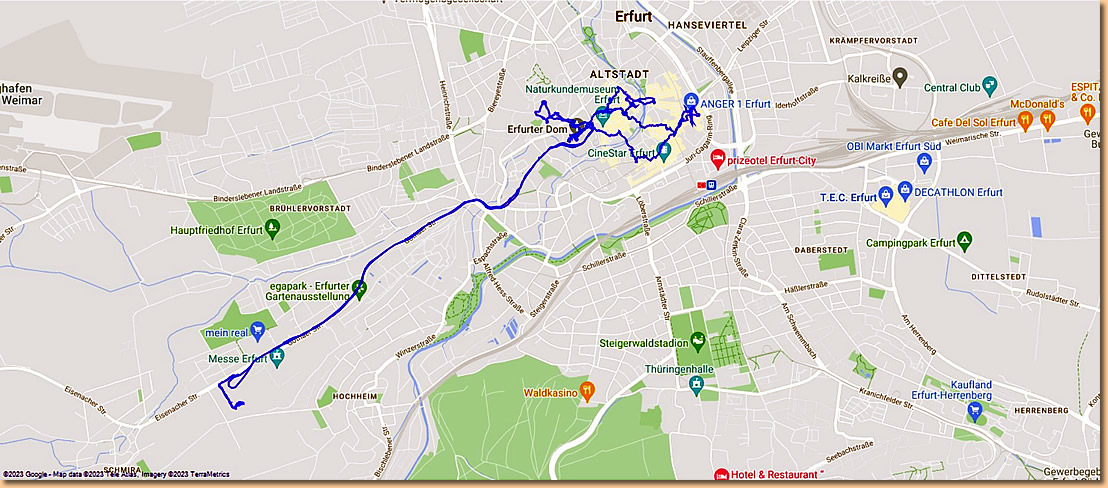 Zur Stadtbahn in die Innenstadt sind es nur ein paar Meter, die Fahrt dauert keine 15 Minuten und schon kann die Besichtigungstour losgehen. Über der Erfurter Altstadt erhebt sich die Zitadelle Petersberg, eine der grössten und einzig weitgehend erhaltenen barocken Stadtfestung Mitteleuropas. Sie ist sternförmig angelegt und für die damalige Zeit uneinnehmbar. Wir schaffen es, nehmen anstelle des Lifts die Stufen und stehen bald vielleicht auf dem damaligen Exerzierplatz und staunen über die seit 1990 rekonstruierten Gebäude. Nach einem Rundgang gehts wieder hinunter, unser nächstes Ziel ist der Dom St. Marien und die Kirche St. Severi, zusammen das Wahrzeichen von Erfurt. |