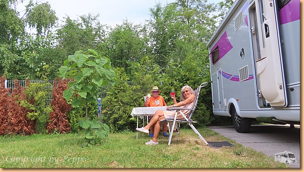 Nach dem üblichen Ankommensschluck spaziert Helga zum 1,3 km entfernten Rewemarkt, ich bleibe da, einer muss ja aufs Haus aufpassen ! Mittagessen kochen fällt der Wärme und auch der zunehmenden Schwüle zum Opfer, es gibt nur eine grosse Schüssel Wurstsalat mit frischem Brot und als flüssige Beilage ein kühles Blondes. Der Schwüle folgt am Abend ein kurzer Regenguss, also ab ins Womo zur Hüttenschicht und zu den diversen Schreibarbeiten. |