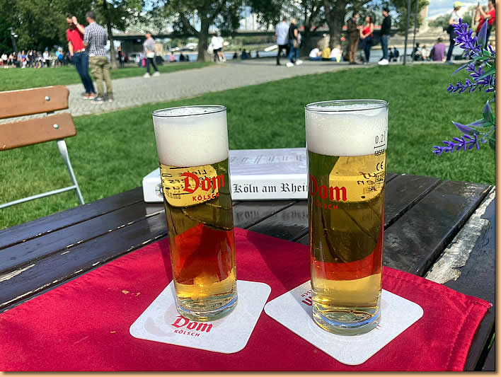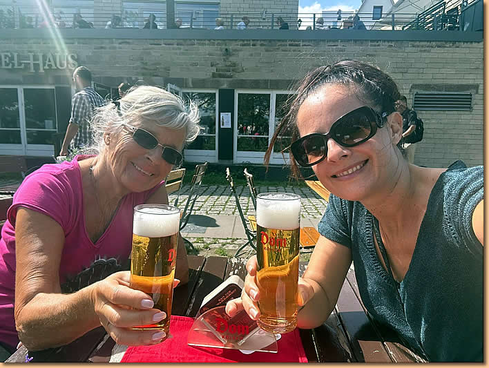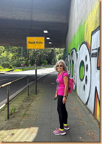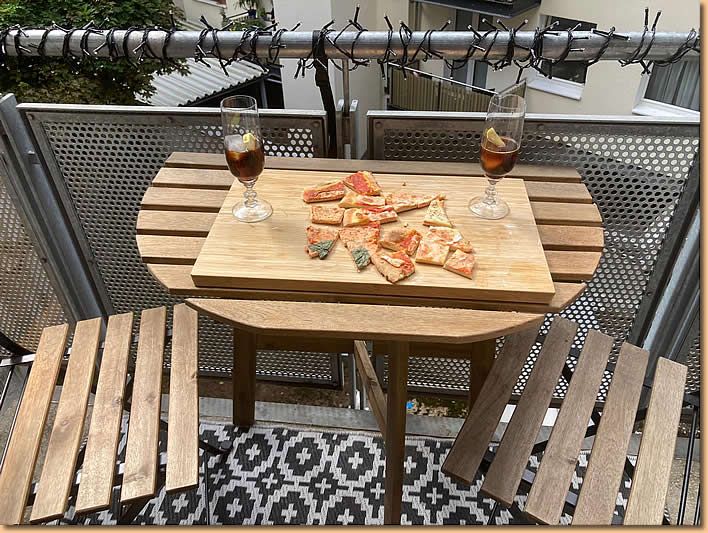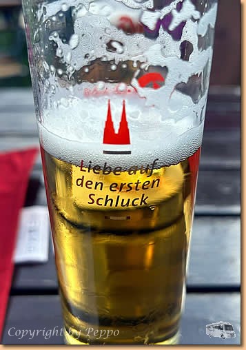 In den frühen Morgenstunden zieht ein Gewitter drüber und es kühlt ordentlich ab, die heutige Tagestemperatur soll 22 Grad nicht übersteigen. Nach dem Frühstück und einer Besichtigung ihrer Wohnung (fällt positiv aus) laufen wir erst einmal ca. 7 Kilometer durch Parkanlagen und Schrebergärten. Und natürlich gibt's auch in Köln auf Balkonien einen Apero. |