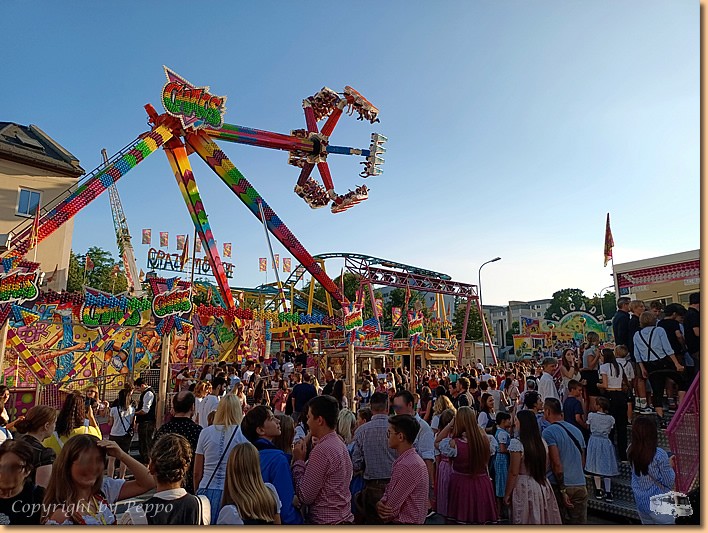 Einigen statten wir einen Besuch ab, lassen uns dann aber im Zelt einer Hendlbraterei nieder und lassen uns ein knuspriges Grillhendl schmecken. Nach ca. 4 Stunden sind wir wieder daheim, schauen für heuer das letzte Mal vom Balkon aus dem Riesenrad zu und lassen damit den Kirchtag 2023 gemütlich ausklingen.