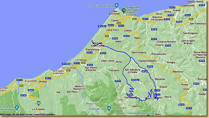Bevor wir allerdings nach 49 km fast wieder am Ausgangspunkt in Rocca di Capri Leone ankommen geniessen wir die wunderschönen Ausblicke auf der Fahrt durch das Nebrodigebirge. Beim Obsthändler in der Stadt decken wir uns mit Erdbeeren und Mandarinen ein. |