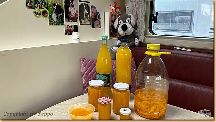 Heute gibt es nur eines, Hüttenschicht, Hüttenschicht und nochmals Hüttenschicht! In den Morgenstunden fängt es zu stürmen an, Regenschauer mischen mit und die Sonne versteckt sich fast den ganzen Tag hinter dunklen Wolken. Was machen wir somit? Mandarinenmarmelade, Mandarincello und es wird auch gleich wieder welcher angesetzt. |