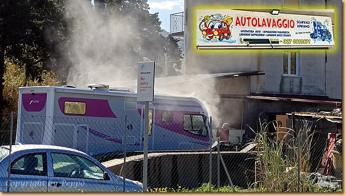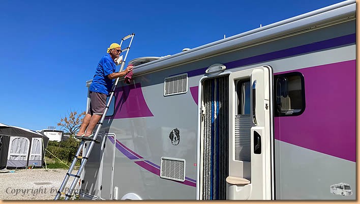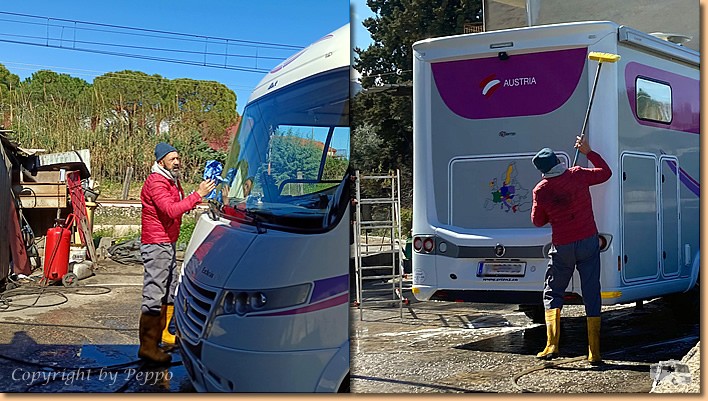 Keine 300 Meter vom Campingplatz entfernt gibts eine Autowaschanlage und da hat unser Womo heute um 9:30 Uhr einen Termin. Eine Stunde später können wir es wieder abholen, von Salz und Schmutz befreit schaut es gleich wieder besser aus. |