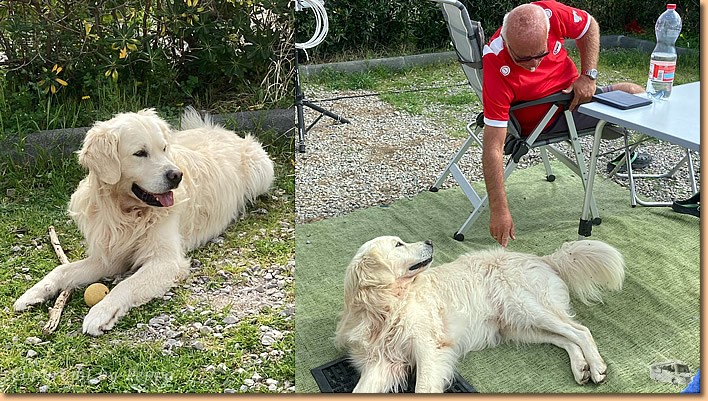 Kaum daheim lässt unser Wärmespender das Sitzen vorm Womo zu wo wir nach kurzer Zeit Besuch vom Nachbarhund Lumi bekommen. Graziella überrascht uns mit 2 Stück von ihrer Geburtstagstorte, herzlichen Dank und buon compleano! |