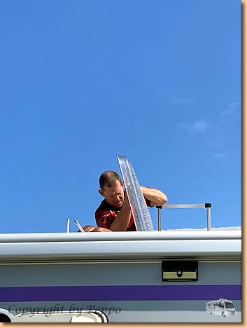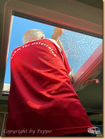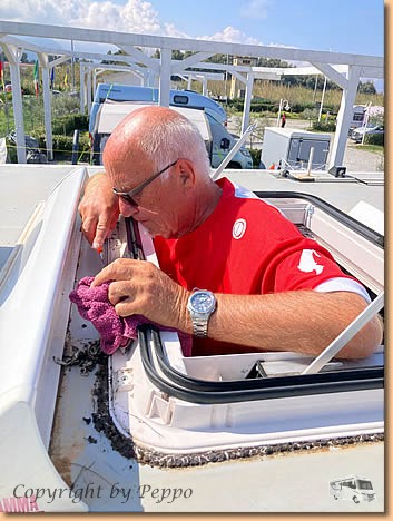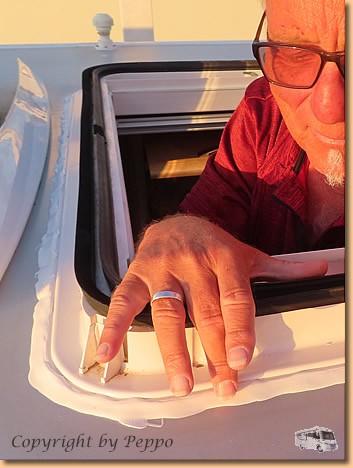 Heute morgen macht Alessandra einen Termin beim Doc für mich aus und nach dem Frühstück beginne ich mit den Arbeiten. Ingo kommt mir zu Hilfe, gemeinsam bauen wir die Dachluke ab damit ich rundherum nach Reinigung neue Dichtmasse anbringen kann. Ich vermute, dass der Autowäscher mit seinem Kärcher ganze Arbeit geleistet hat. Aber sei es wie es sei, alles wieder o.k., alles dicht, Dachluke komplett und wir hoffen, dass es dies auch gewesen ist. Zeigen wird es der nächste Regen. Danke Ingo für deine Hilfe, um 18:30 Uhr darf der Zahnarzt seinem Job nachkommen und wie auf Bestellung fängt es dann leicht zu tröpfeln an. |