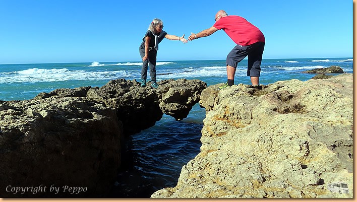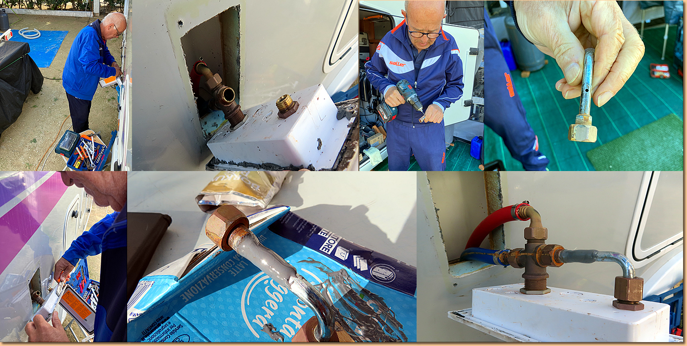 Heute haben wir wieder einmal "Action" genug. Der Tag beginnt mit den üblichen Arbeiten, Helga ist auf der Morgenrunde, ich bin für das Frühstück und den "Stalldienst" zuständig. Kassette raus, entsorgen, in ca. 5 Minuten später retour und dann der Schreck am Morgen. Wasser rinnt aus dem Doppelboden! Pumpe ausschalten, Leck suchen und Klaus um Hilfe bitten. Er ist auch sofort zur Stelle, der Urheber, ein Loch im Metallrohr der Aussendusche (nach 7 Jahren durchgerostet) ist gefunden und in kürzester Zeit mit Flüssigmetall wieder repariert. |