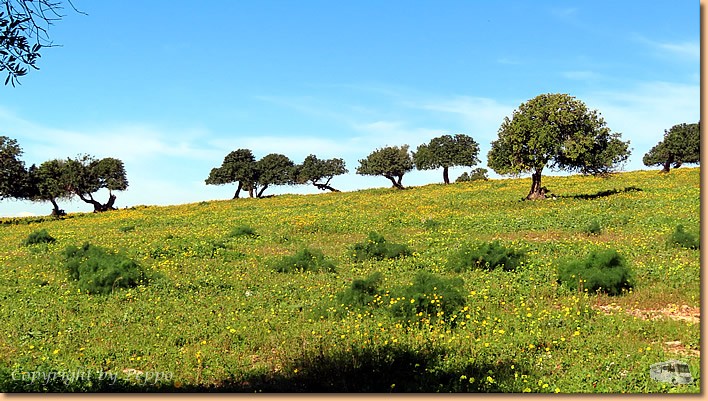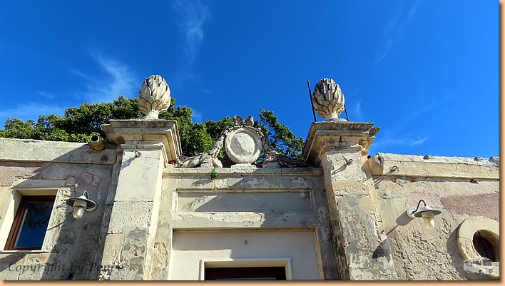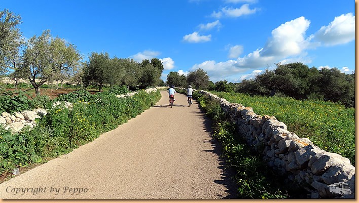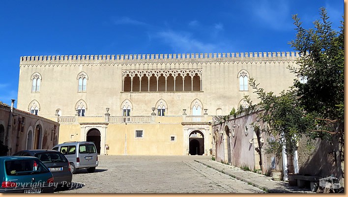 Sonne da, kein Wind, keine Wolken, wir sitzen schon auf den Rädern und auf gehts nach Donnafugata. Zwischen Folientunneln und auf nicht gerade perfekten Strassen gehts die ersten zehn Kilometer dahin, dann gehts auf einer kleinen aber feinen Strasse nochmals ca. sechs Kilometer bergauf zum Schloss. Eine wunderschöne Gegend, irgendwie erinnert es an daheim, satte grüne Wiesen, Kühe und Schafe, wir sind immer aufs neue begeistert. |