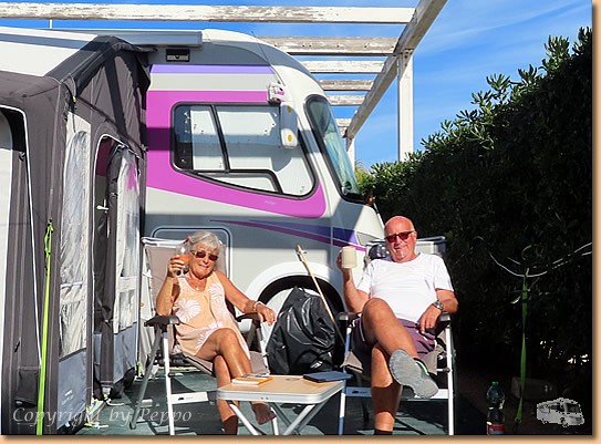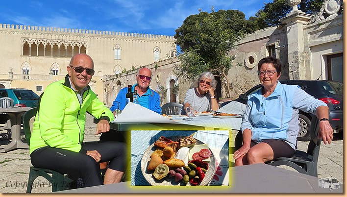 Im Ristorante vorm Schloss erwartet uns, wie schon im letzten Jahr, ein ausgezeichneter rustikaler Vorspeisenteller, Sonne, vino bianco und blauer Himmel - was wollen wir eigentlich noch mehr? Retour am Campingplatz gibts bei Oli noch einen vino und dann heißt es bald ab ins Womo, ciao, danke für den netten Tag, Homeoffice wartet auf uns. |
