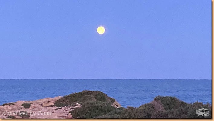Mondbegleitung beim Morgenspaziergang und mit einem wunderschönen Sonnenuntergang verabschiedet sich der Tag von uns. Es gibt heute nix zu berichten, es ist ein ausgesprochener Faulenzertag. |